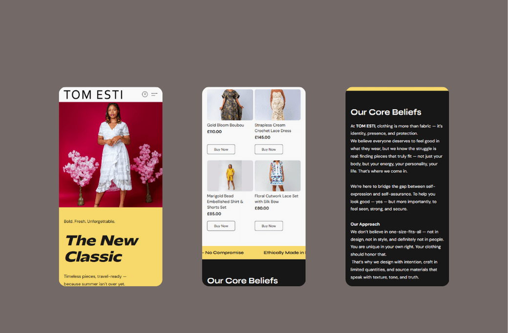 TOM ESTI is a fashion brand needing a functional ecommerce presence. The goal was to design and build a simple, accessible, and easy-to-manage shopping experience within tight budget and timeline constraints. The work focused on UX-led web design, ecommerce build, and competitive analysis, delivering a site based on familiar patterns that reduce friction and build trust.